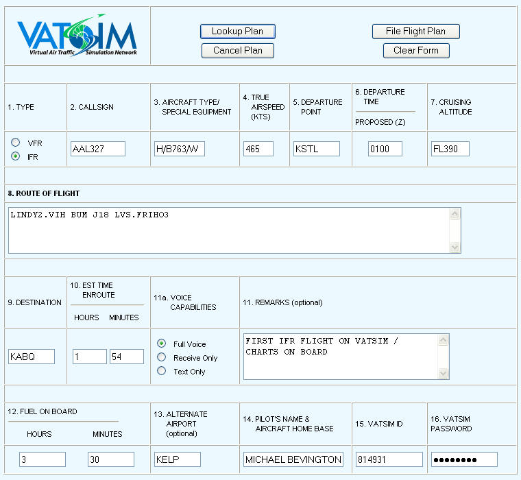VATSIMに接続する前に、フライトプランマネジメントウェブサイトにアクセスしてください。このページにはフライトプランに必要なすべての項目が含ま れます。フォームを埋め終わったら、"File Flight Plan"ボタンをクリックしてください。下記で各フォームについて順々に述べていきます。これでVATSIMへ接続する準備ができました。ウェブサイト に入力したのと同じコールサイン、機種、搭載機器を使って接続するのを確実にしてください。