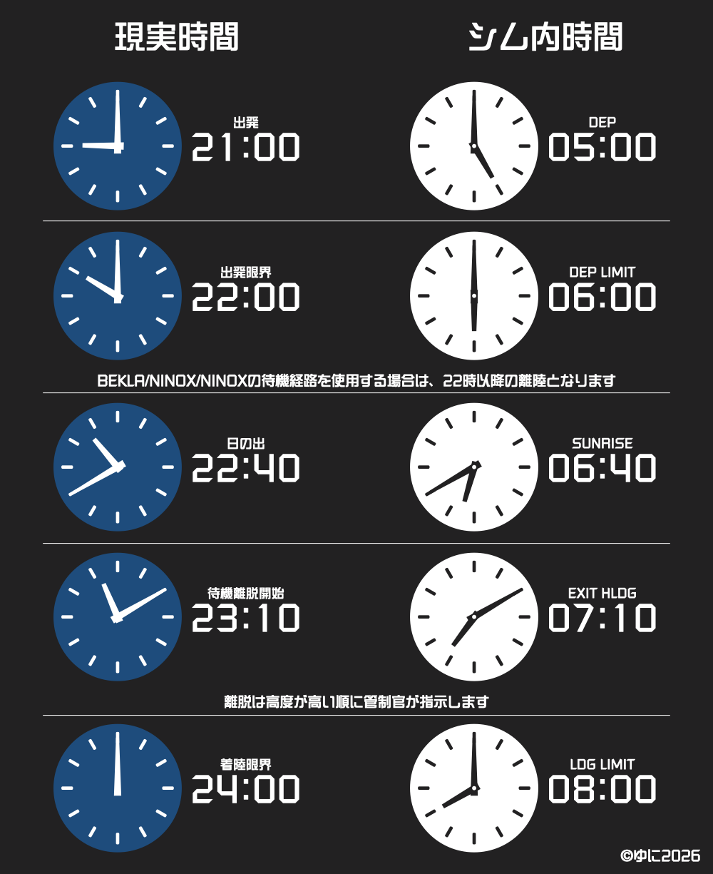 ※このルートは夜間飛行することができないため、22時(シム内時間の6時)以降の離陸となります。